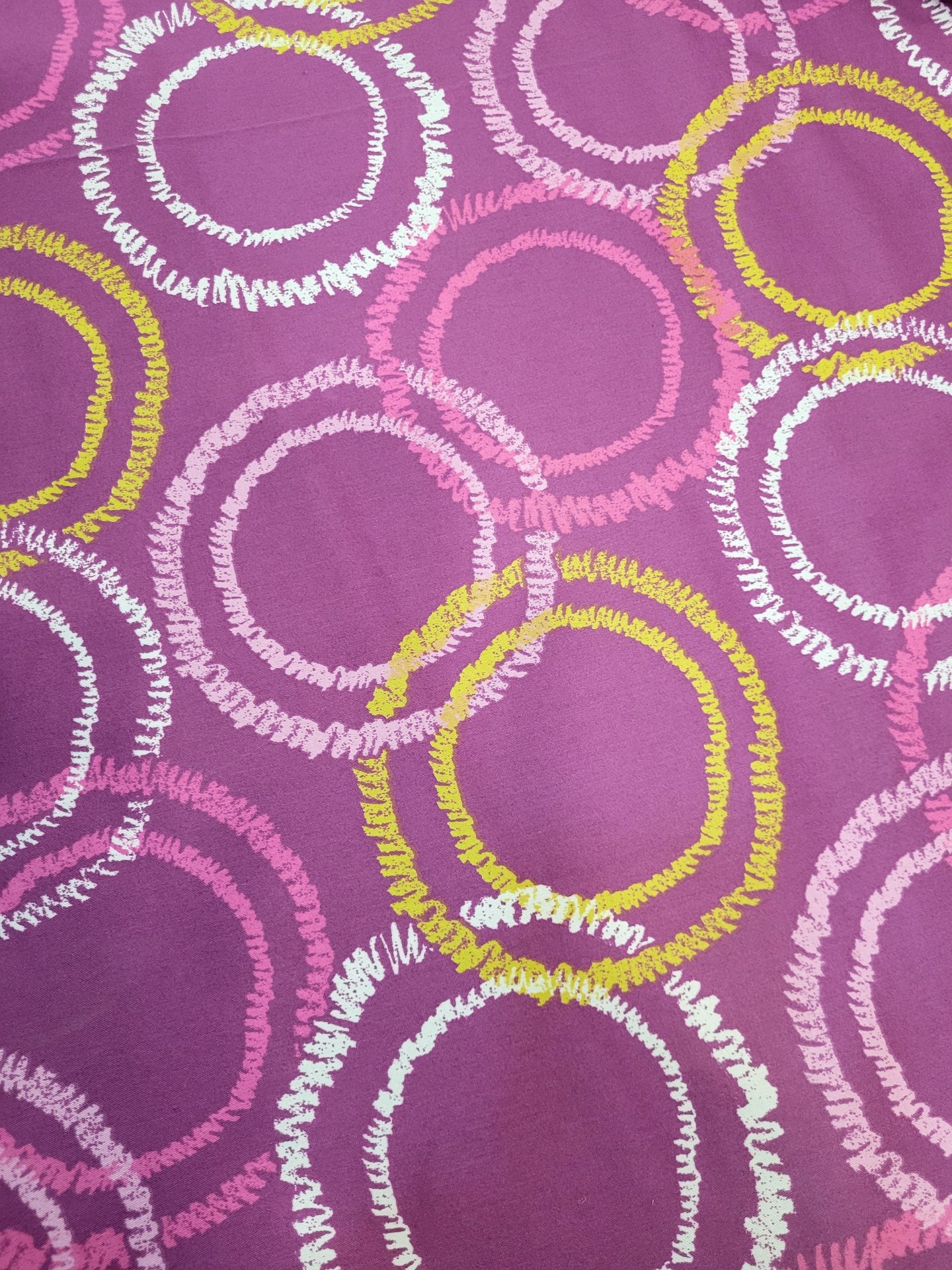 Εξαιρετικής ποιότητας βαμβακοσατέν σε 2.80 φάρδος ΜΏΒ φόντο με κύκλους άσπρους φούξια λιλά κίτρινους κατάλληλο για κουρτίνα ,πάπλωμα, παπλωματοθήκη μαξιλάρια, τραπεζομάντηλο