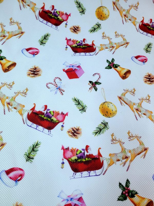 Χριστουγεννιάτικο ύφασμα άσπρο με στολίδια χρωματιστά και τον Άγιο Βασίλη σε έλκυθρο σε 1.50 φάρδος για τραπεζομάντηλο, διακόσμηση