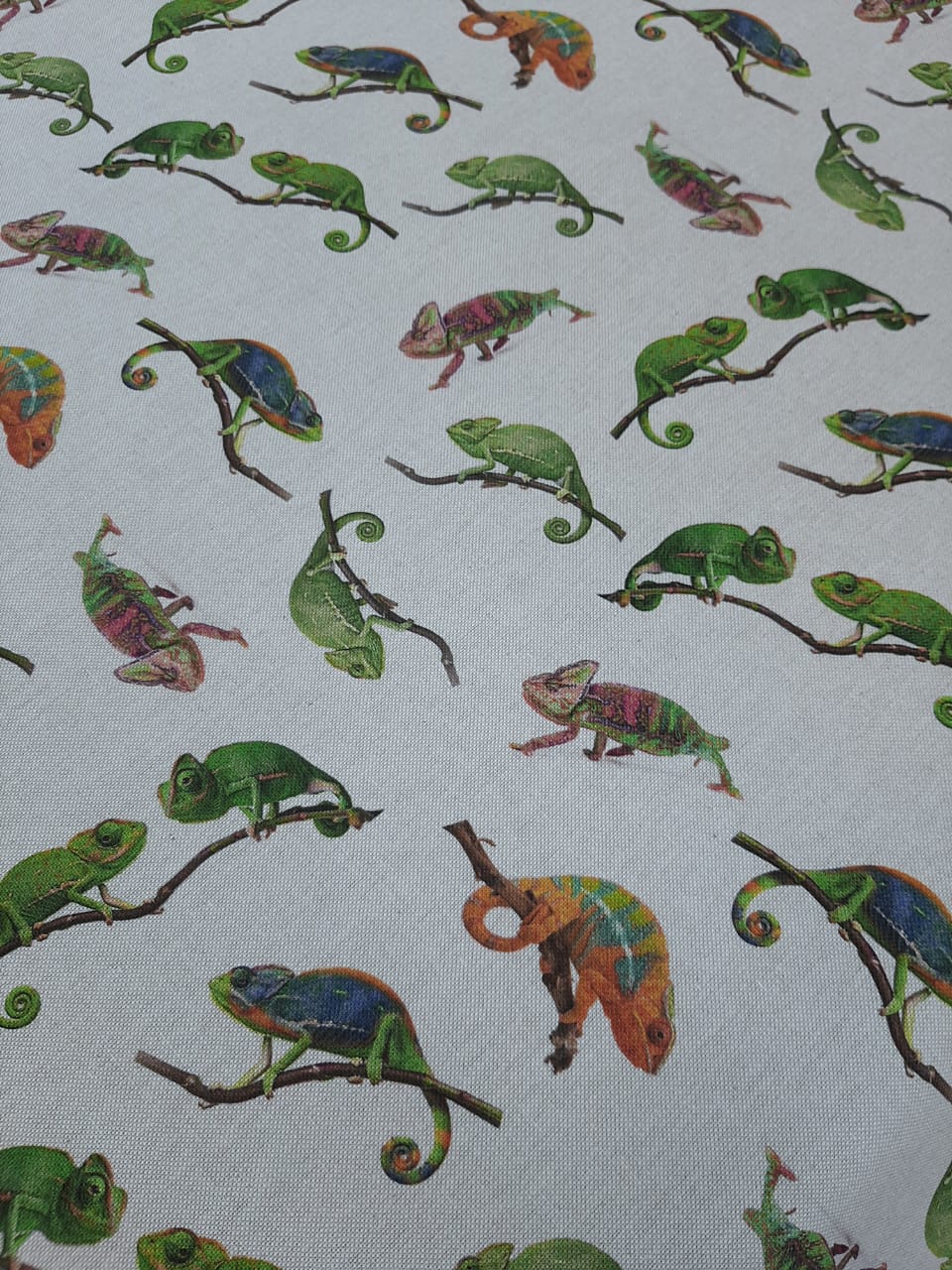 ύφασμα τύπου λινό σε μπέζ σπαγγί βαση μαλακο καραβόπανο και φωτογραφίες ερπετών χαμαιλέων.