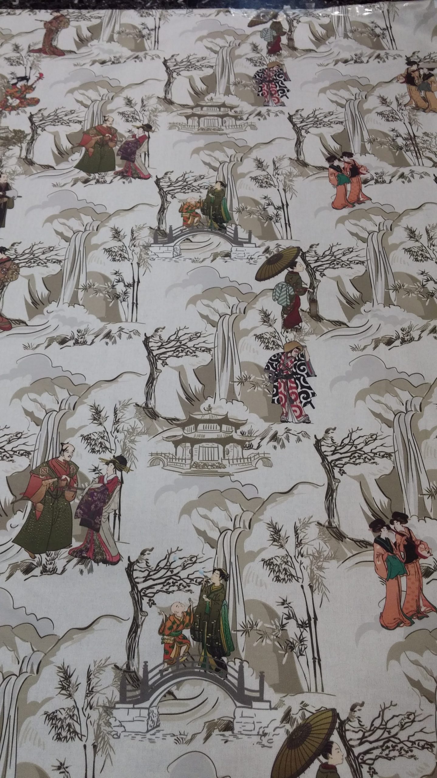 Ύφασμα καραβόπανο σε 2,80 φάρδος Ιαπωνικού παραδοσιακού τοπίου σε λαδί απόχρωση γιά κουρτίνα,ντύσιμο καναπέ,μαξιλάρια κ κάθε χρήση διακόσμησης