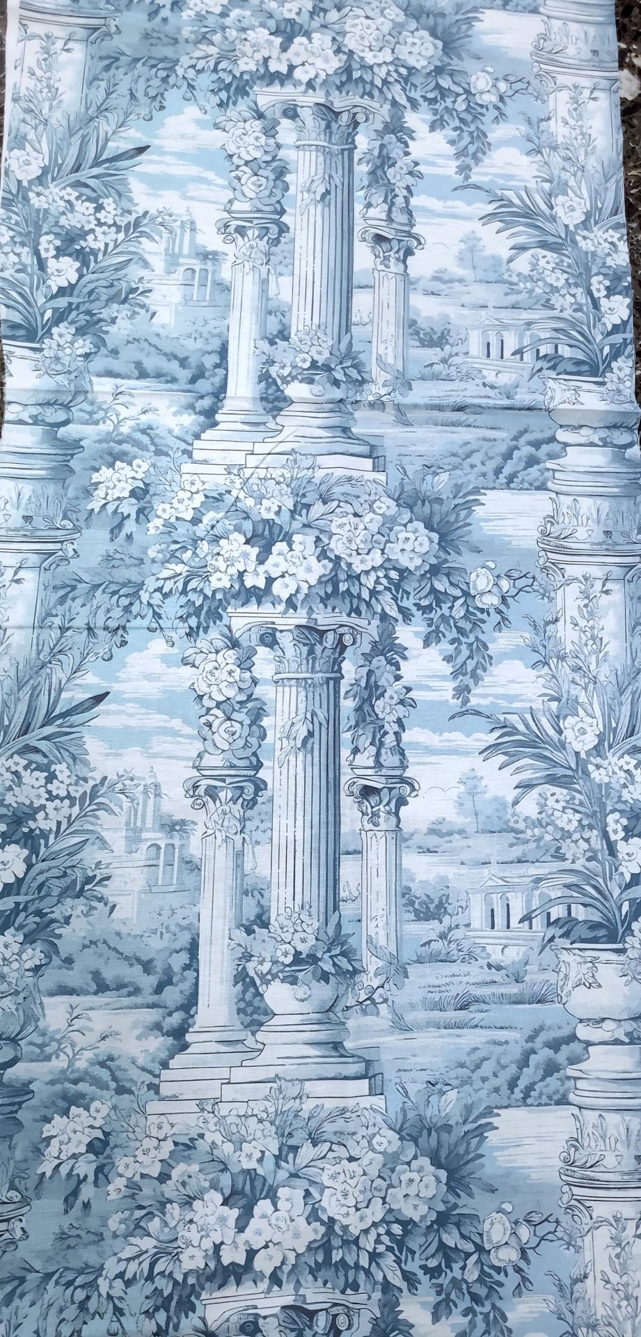 ύφασμα βαμβακερό καραβόπανο Αρχαία κολώνα σε κήπο toile de jouy σε σιέλ φόντο και 2.80 φάρδος.