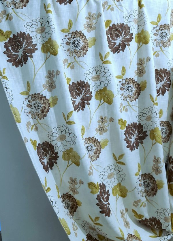 κουρτίνα γάζα λευκή χονδρή τύπου λινή με λουλούδι καφέ με λαδί φύλλα σε 3 μετρα ύψος