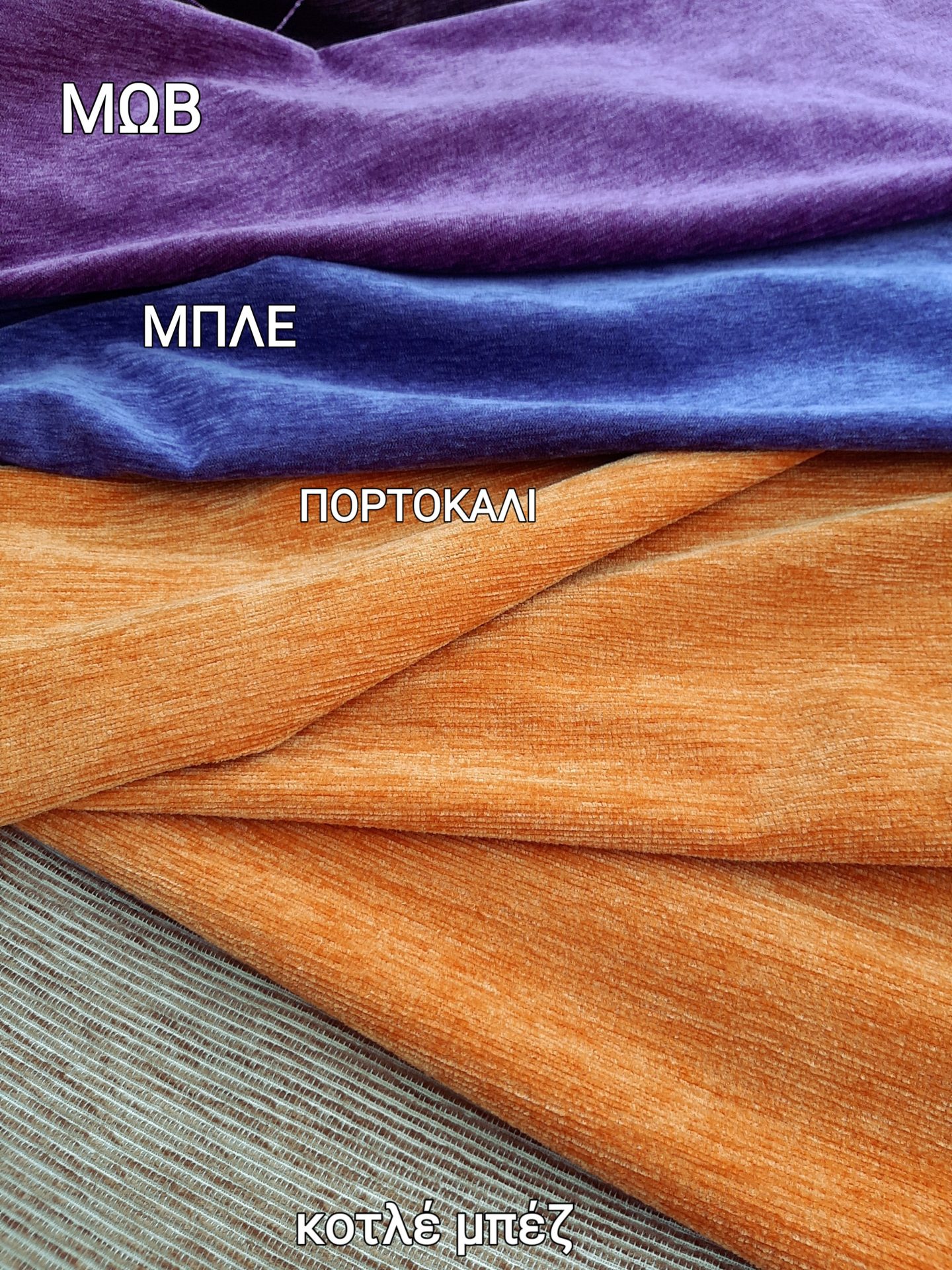 Υφάσματα σενίλ για ριχτάρια ΜΩΒ, ΜΠΛΕ, ΠΟΡΤΟΚΑΛΙ και ΚΟΤΛΕ ΜΠΕΖ εξαιρετική ποιότητα μαλακά και χονδρά για ριχτάρια, κουρτίνα, ταπετσαρία επίπλωσης.
