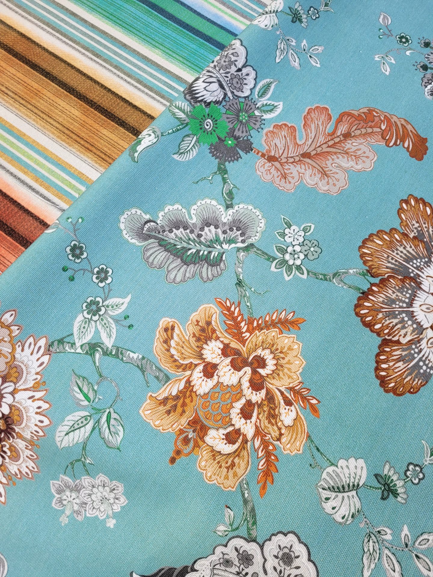 Εξαιρετικής ποιότητας αλέκιαστο, αδιάβροχο, βαμβακερό ύφασμα καραβόπανο χονδρό, έθνικ φλοράλ σε φόντο μέντα σιέλ σε 2.80 φάρδος. Κατάλληλο για επίπλωση αφού ειναι 700gr/μετρο αλλα και κουρτίνα, μαξιλάρια κήπου,παραλίας αλλα και εσωτερικού χώρου, τσάντες και κάθε διακόσμηση.