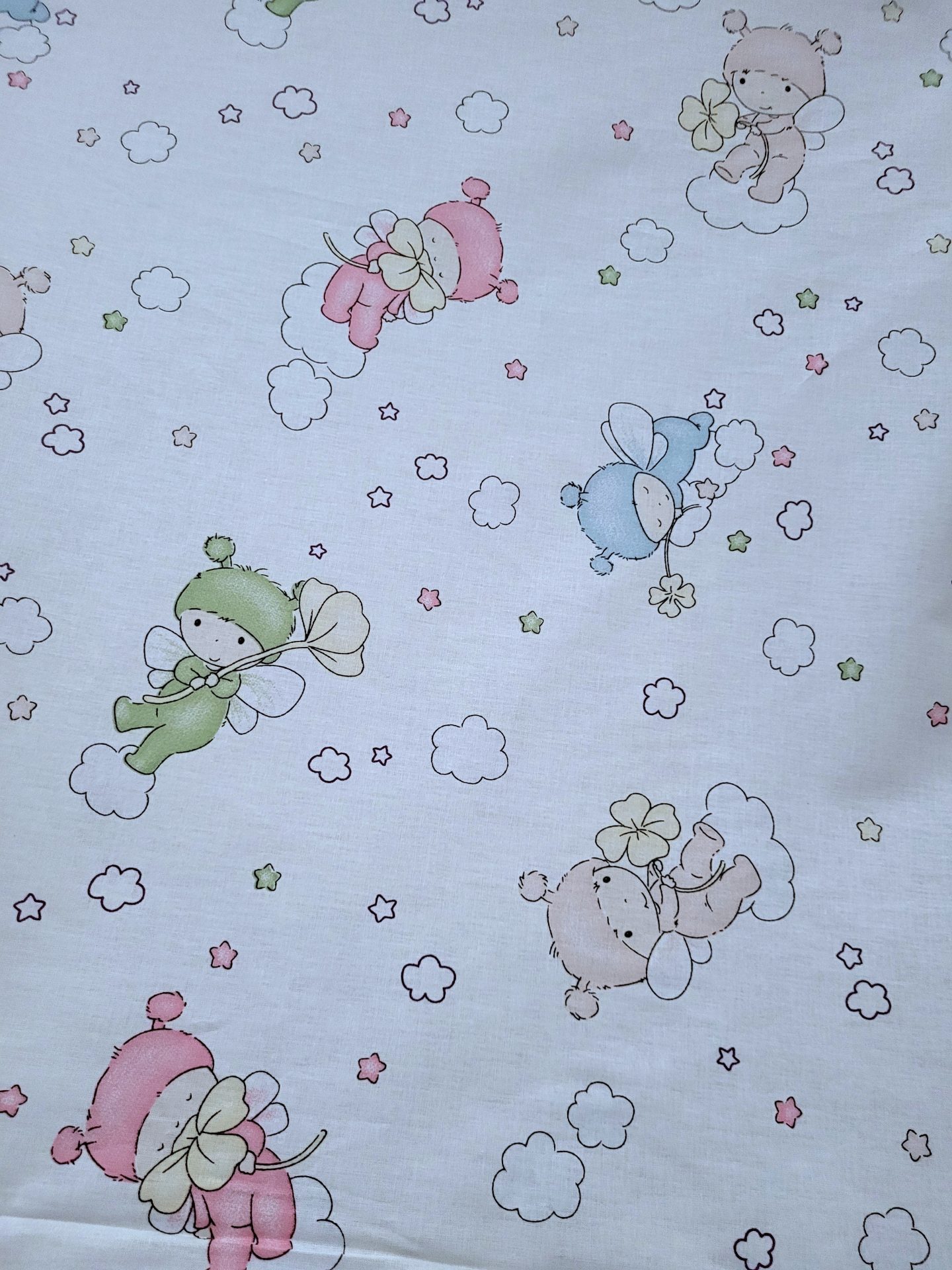 ύφασμα βαμβακερό για παιδικό σεντόνι με μωράκια ροδί πράσινα σιέλ σε άσπρο φόντο σε 2.40 φάρδος