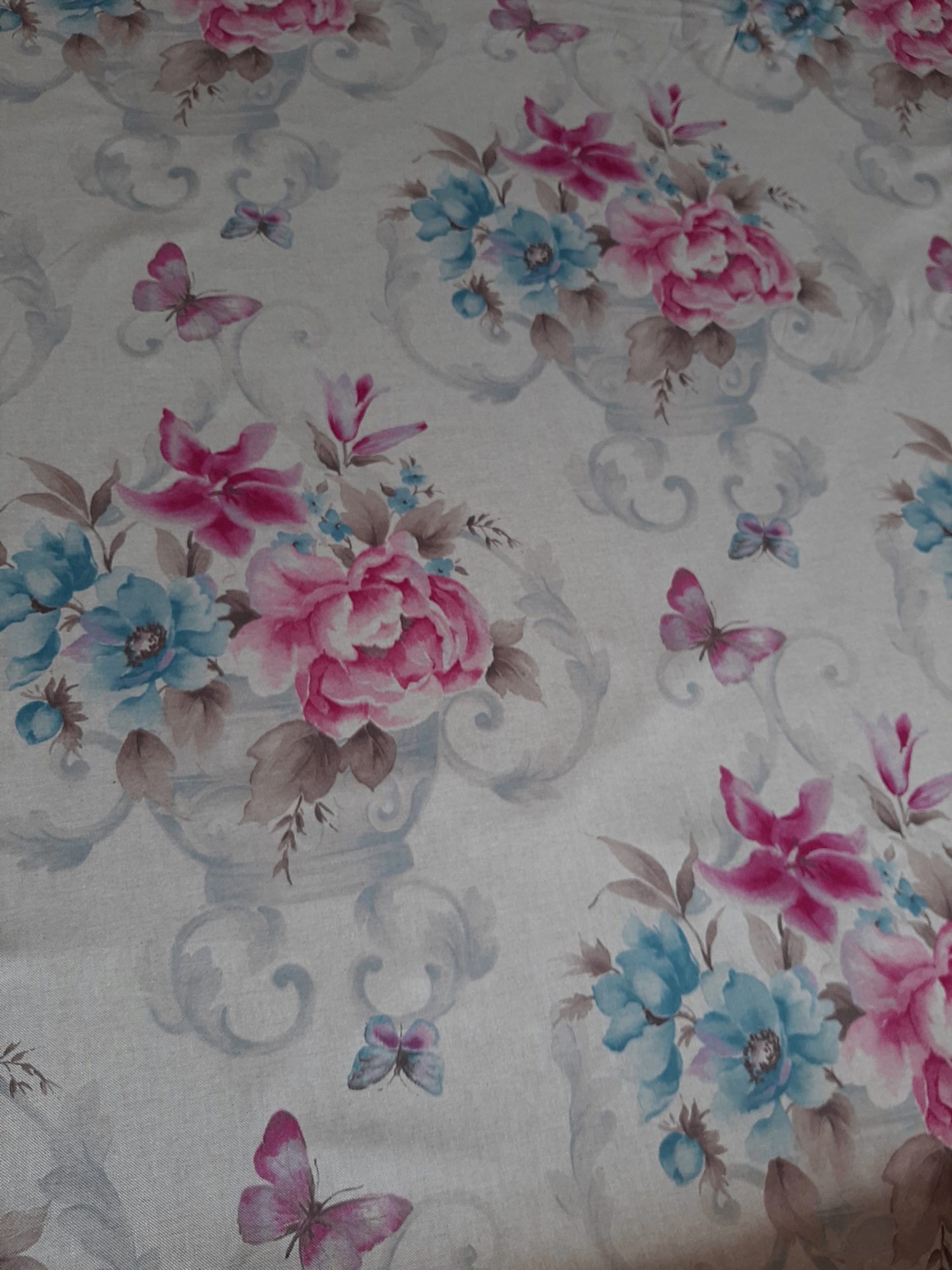 ΎΦΑΣΜΑ καραβόπανο μαλακό τύπου λινό αμφορέας μπαρόκ με μπουκέτο λουλούδια τυρκουάζ ροδί και σκόρπιες πεταλούδες μώβ