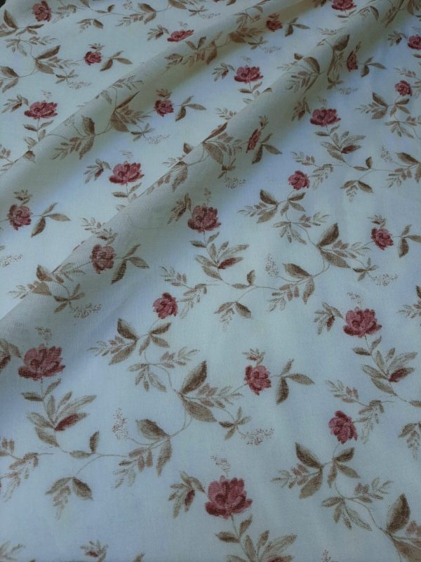 Ύφασμα κουρτίνας με το μέτρο γάζα σε φόντο -εκρού τύπου λινού και σάπιο μήλο λουλούδι με γκρί μπέζ κλαδιά και φυλλαράκια σε ύψος 2.80