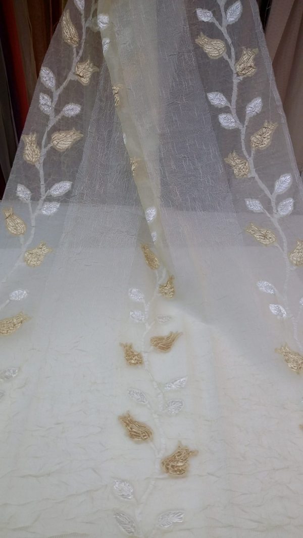 κουρτίνα γάζα τσαλακωτή λευκή-εκρού με σχέδιο λουλούδια φύλλα αναριχώμενα σε μπέζ χρυσό σε 3 μέτρα ύψος με βαρίδι