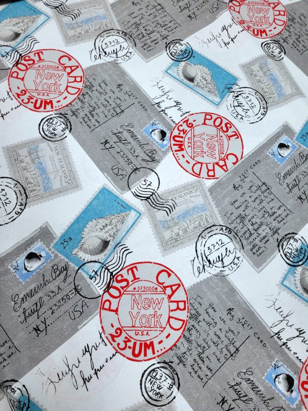 ύφασμα με το μέτρο γραμματόσημα με θαλασσινό ταξιδιωτικό θέμα κοχύλια μπέζ σε τυρκουάζ φοντο και γράμματα και σφραγίδα κόκκινη